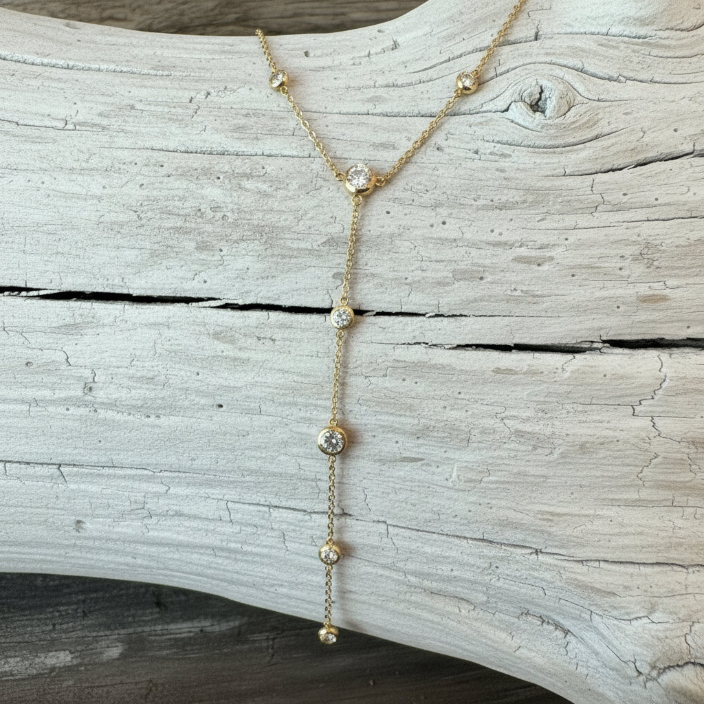 This graceful Y necklace showcases the timeless appeal of cubic zirconia brilliance paired with elegant 14K gold plating. The distinctive Y-drop design creates a sophisticated silhouette that flatters any neckline, while the carefully positioned CZ accents sparkle with refined radiance. Perfect for those who appreciate understated luxury, this piece transitions effortlessly from professional settings to evening occasions, offering versatile elegance that complements your most treasured moments.