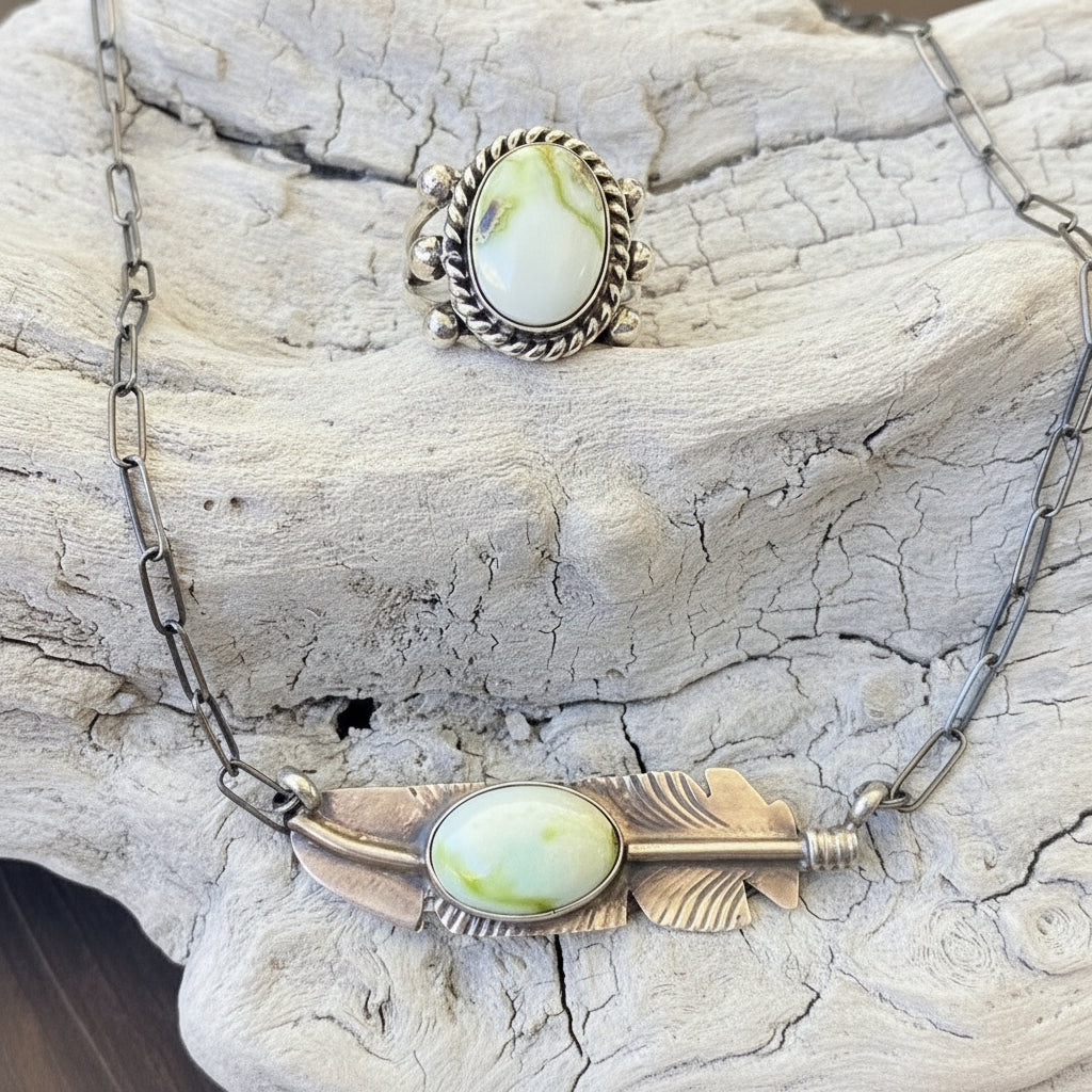 This curated duo pairs a striking Sonoran turquoise sterling silver ring with a matching feather necklace, both showcasing the stone's coveted blue-green patina. The harmonious set celebrates the raw elegance of the American Southwest, where each piece reflects nature's artistry. Wear them together for a cohesive statement or separately to suit your mood. A sophisticated choice for those who seek jewelry with depth, authenticity, and timeless appeal.